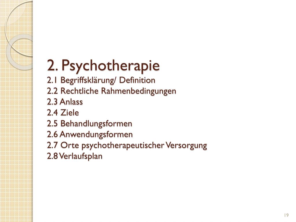 2. Psychotherapie2.1 Begriffsklärung/ Definition2.2 Rechtliche Rahmenbedingungen2.3 Anlass2.4 Ziele2.5 Behandlungsformen2.6 Anwendungsformen2.7 Orte psychotherapeutischer Versorgung2.8 Verlaufsplan