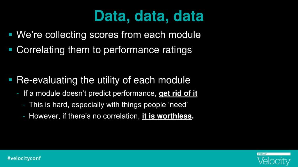 Data, data, data • We’re collecting scores from each module • Correlating them to performance ratings • Re-evaluating the utility of each module • If a module doesn’t predict performance, get rid of it • This is hard, especially with things people ‘need’ • However, if there’s no correlation, it is worthless.