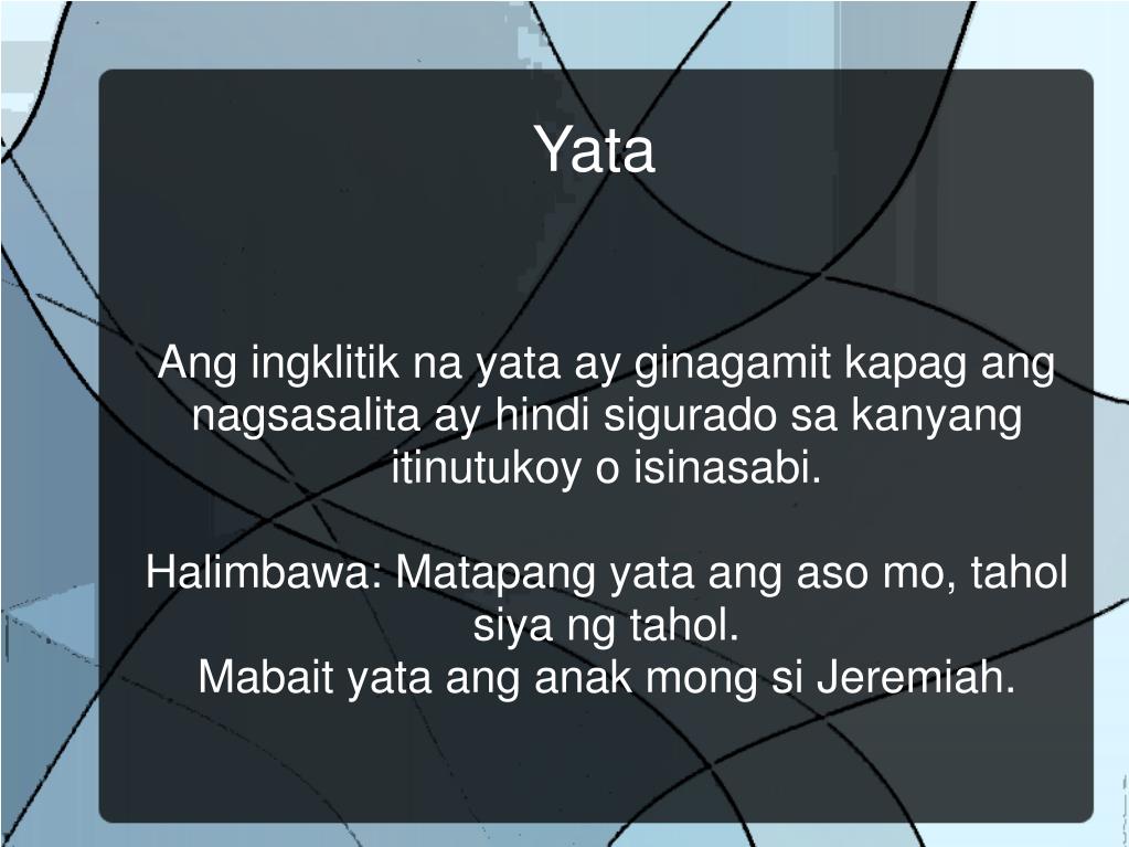 Pangkat 6 Anthony Chiang Warren Cheah Richard Cruz Jules Marcelino Joshua Santos. Ingklitik (Yata, Man, Muna, Kaya). Ang ingklitik na yata ay ginagamit kapag ang nagsasalita ay hindi sigurado sa kanyang itinutukoy o isinasabi. Halimbawa: Matapang yata ang aso mo, tahol siya ng tahol.