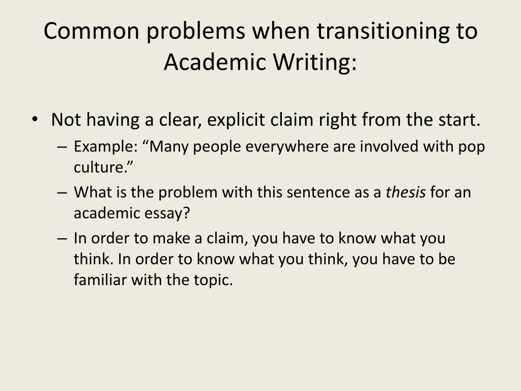 Common problems when transitioning to Academic Writing: • Not having a clear, explicit claim right from the start. • Example: “Many people everywhere are involved with pop culture.” • What is the problem with this sentence as a thesis for an academic essay? • In order to make a claim, you have to know what you think. In order to know what you think, you have to be familiar with the topic.