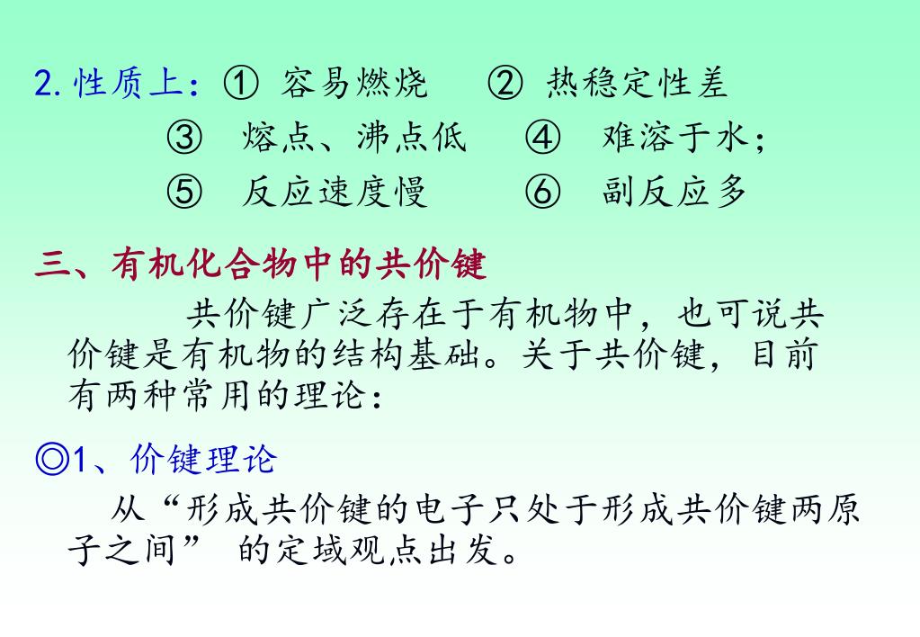 2.性质上:① 容易燃烧 ② 热稳定性差 ③ 熔点、沸点低 ④ 难溶于水; ⑤ 反应速度慢 ⑥ 副反应多 三、有机化合物中的共价键 共价键广泛存在于有机物中,也可说共价键是有机物的结构基础。关于共价键,目前有两种常用的理论: ◎1、价键理论 从“形成共价键的电子只处于形成共价键两原子之间” 的定域观点出发。