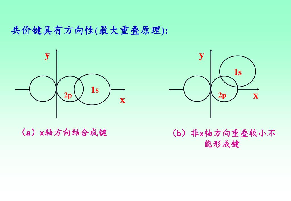 共价键具有方向性(最大重叠原理): y y 1s 1s x 2p 2p x (a)x轴方向结合成键 (b)非x轴方向重叠较小不能形成键