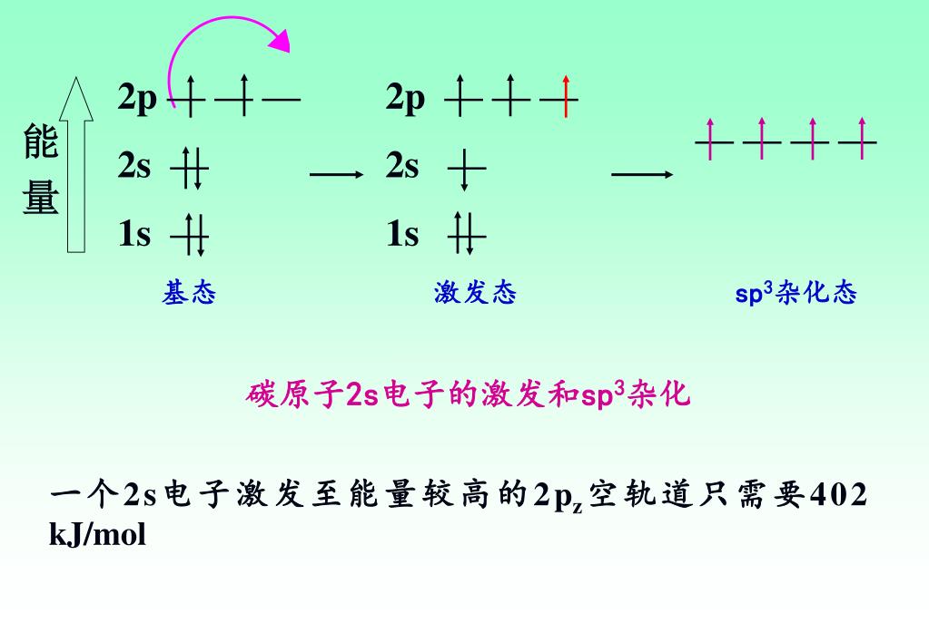 2p — — — 2s — 1s — 2p — — — 2s — 1s — — — — — 能 量 基态 激发态 sp3杂化态 碳原子2s电子的激发和sp3杂化 一个2s电子激发至能量较高的2pz空轨道只需要402 kJ/mol