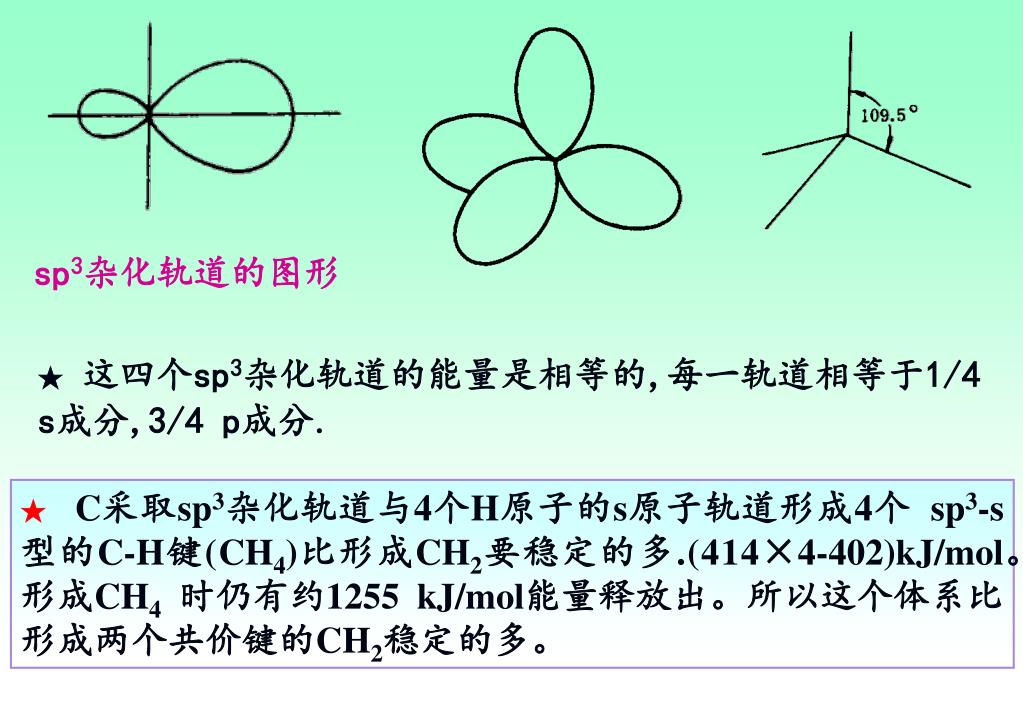 sp3杂化轨道的图形 ★这四个sp3杂化轨道的能量是相等的,每一轨道相等于1/4 s成分,3/4 p成分. ★C采取sp3杂化轨道与4个H原子的s原子轨道形成4个 sp3-s型的C-H键(CH4)比形成CH2要稳定的多.(414×4-402)kJ/mol。形成CH4时仍有约1255 kJ/mol能量释放出。所以这个体系比形成两个共价键的CH2稳定的多。