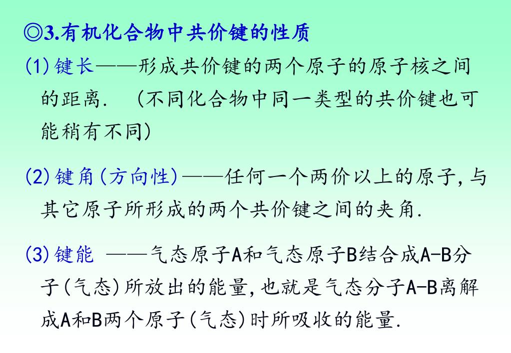 ◎3.有机化合物中共价键的性质 (1)键长——形成共价键的两个原子的原子核之间的距离. (不同化合物中同一类型的共价键也可能稍有不同) (2)键角(方向性)——任何一个两价以上的原子,与其它原子所形成的两个共价键之间的夹角. (3)键能——气态原子A和气态原子B结合成A-B分子(气态)所放出的能量,也就是气态分子A-B离解成A和B两个原子(气态)时所吸收的能量.