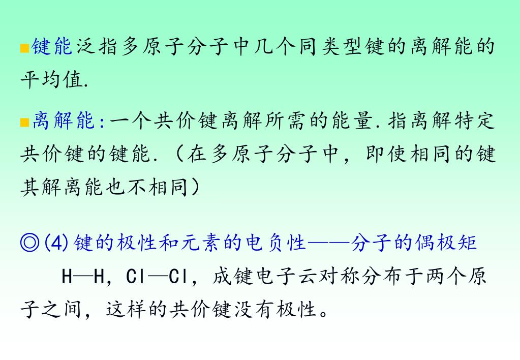 键能泛指多原子分子中几个同类型键的离解能的平均值.键能泛指多原子分子中几个同类型键的离解能的平均值. 离解能:一个共价键离解所需的能量.指离解特定共价键的键能.(在多原子分子中,即使相同的键其解离能也不相同) ◎(4)键的极性和元素的电负性——分子的偶极矩 H—H,Cl—Cl,成键电子云对称分布于两个原子之间,这样的共价键没有极性。