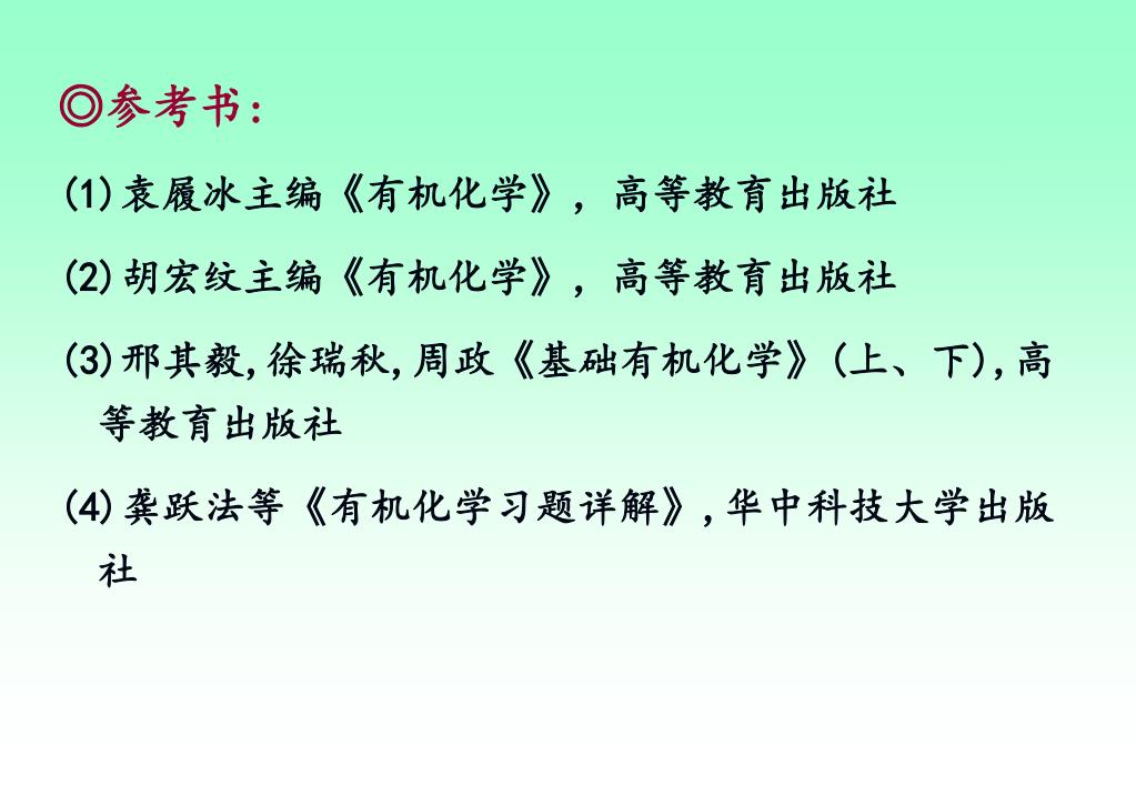 ◎参考书: (1)袁履冰主编《有机化学》,高等教育出版社 (2)胡宏纹主编《有机化学》,高等教育出版社 (3)邢其毅,徐瑞秋,周政《基础有机化学》(上、下),高等教育出版社 (4)龚跃法等《有机化学习题详解》,华中科技大学出版社