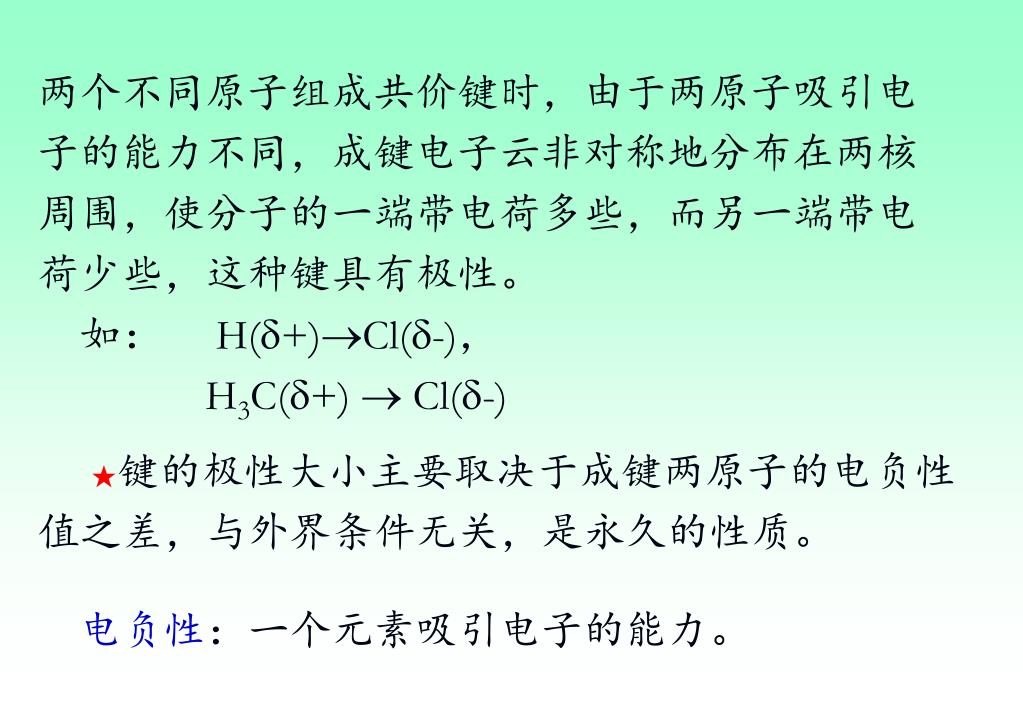 两个不同原子组成共价键时,由于两原子吸引电子的能力不同,成键电子云非对称地分布在两核周围,使分子的一端带电荷多些,而另一端带电荷少些,这种键具有极性。两个不同原子组成共价键时,由于两原子吸引电子的能力不同,成键电子云非对称地分布在两核周围,使分子的一端带电荷多些,而另一端带电荷少些,这种键具有极性。 如: H(+)Cl(-), H3C(+) Cl(-) ★键的极性大小主要取决于成键两原子的电负性值之差,与外界条件无关,是永久的性质。 电负性:一个元素吸引电子的能力。