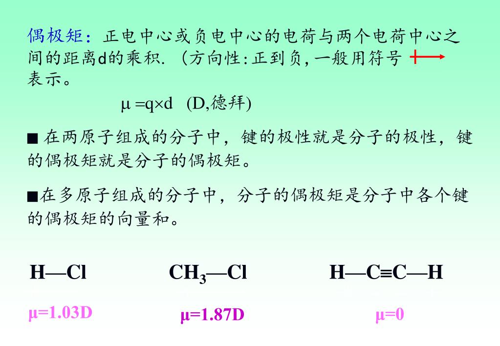 偶极矩:正电中心或负电中心的电荷与两个电荷中心之间的距离d的乘积. (方向性:正到负,一般用符号 表示。 qd (D,德拜) ■在两原子组成的分子中,键的极性就是分子的极性,键的偶极矩就是分子的偶极矩。 ■在多原子组成的分子中,分子的偶极矩是分子中各个键的偶极矩的向量和。 H—Cl CH3—Cl H—CC—H μ=1.03D μ=0 μ=1.87D