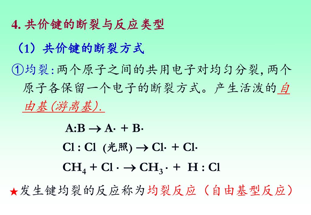 4. 共价键的断裂与反应类型 (1)共价键的断裂方式 ①均裂:两个原子之间的共用电子对均匀分裂,两个原子各保留一个电子的断裂方式。产生活泼的自由基(游离基). A:B A· + B· Cl : Cl (光照) Cl· + Cl· CH4 + Cl · CH3 · + H : Cl ★发生键均裂的反应称为均裂反应(自由基型反应)