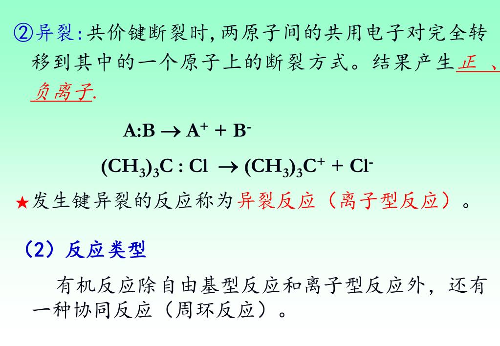②异裂:共价键断裂时,两原子间的共用电子对完全转移到其中的一个原子上的断裂方式。结果产生正 、负离子. A:B A+ + B- (CH3)3C : Cl (CH3)3C+ + Cl- ★发生键异裂的反应称为异裂反应(离子型反应)。 (2)反应类型 有机反应除自由基型反应和离子型反应外,还有一种协同反应(周环反应)。