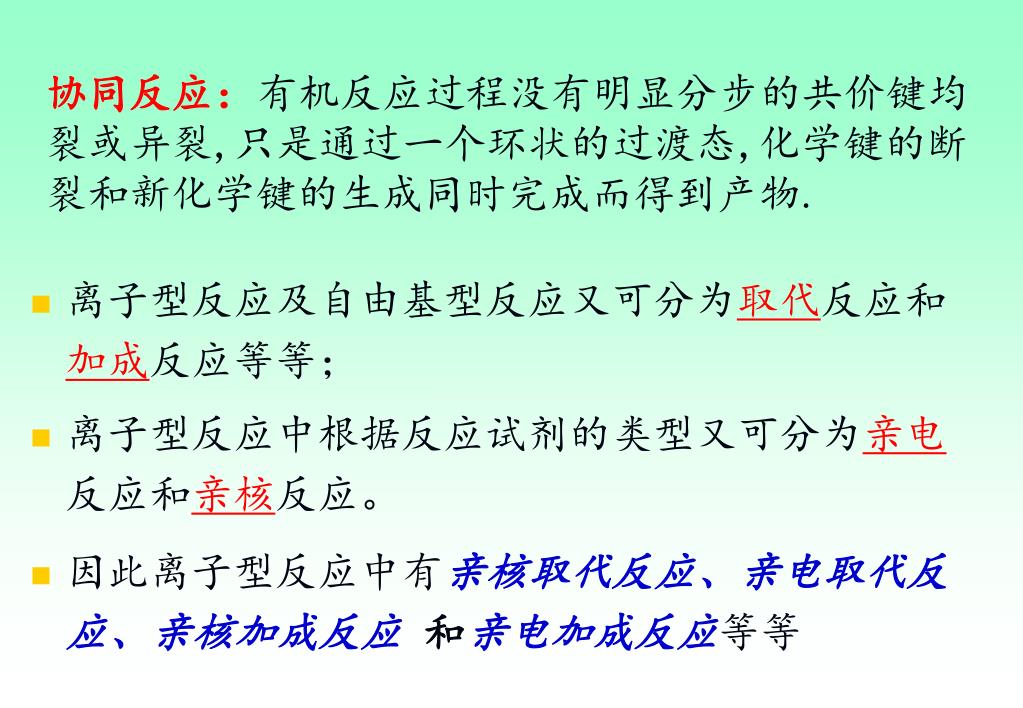 协同反应:有机反应过程没有明显分步的共价键均裂或异裂,只是通过一个环状的过渡态,化学键的断裂和新化学键的生成同时完成而得到产物.协同反应:有机反应过程没有明显分步的共价键均裂或异裂,只是通过一个环状的过渡态,化学键的断裂和新化学键的生成同时完成而得到产物. 离子型反应及自由基型反应又可分为取代反应和加成反应等等; 离子型反应中根据反应试剂的类型又可分为亲电反应和亲核反应。 因此离子型反应中有亲核取代反应、亲电取代反应、亲核加成反应 和亲电加成反应等等