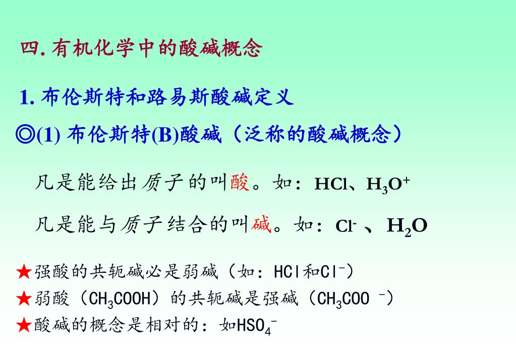 四. 有机化学中的酸碱概念 1. 布伦斯特和路易斯酸碱定义 凡是能给出质子 的叫酸。如:HCl、H3O+ 凡是能与质子 结合的叫碱。如:Cl-、H2O ◎(1) 布伦斯特(B)酸碱(泛称的酸碱概念) ★强酸的共轭碱必是弱碱(如:HCl和Cl-) ★弱酸(CH3COOH)的共轭碱是强碱(CH3COO -) ★酸碱的概念是相对的:如HSO4-