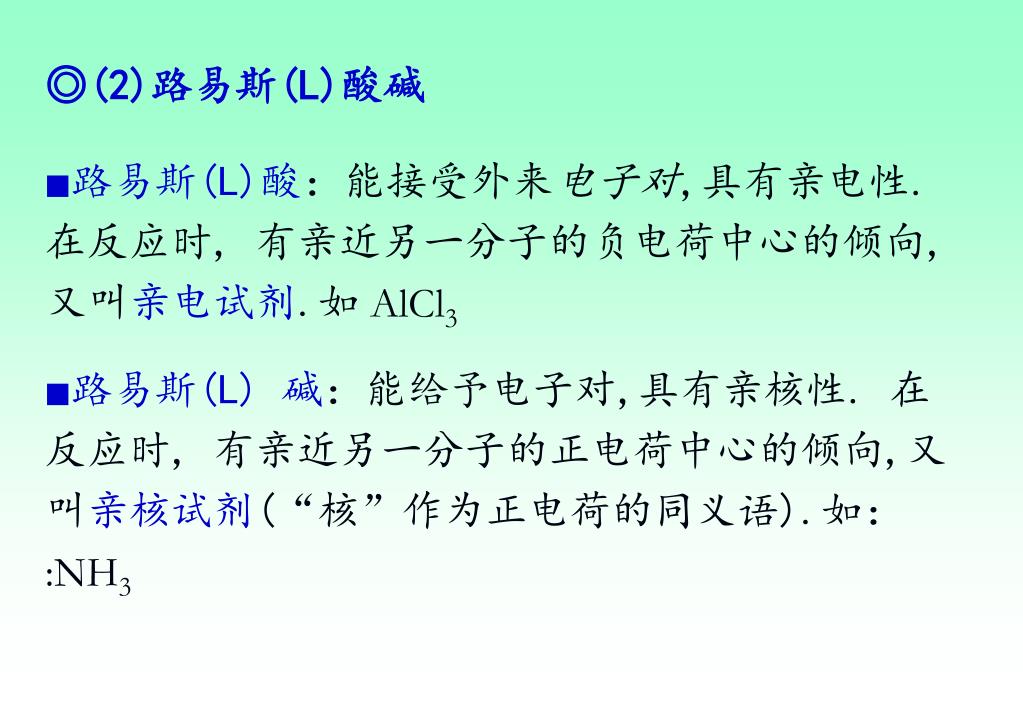 ◎(2)路易斯(L)酸碱 ■路易斯(L)酸:能接受外来电子对,具有亲电性. 在反应时, 有亲近另一分子的负电荷中心的倾向,又叫亲电试剂.如 AlCl3 ■路易斯(L) 碱:能给予电子对,具有亲核性. 在反应时, 有亲近另一分子的正电荷中心的倾向,又叫亲核试剂(“核”作为正电荷的同义语).如: :NH3