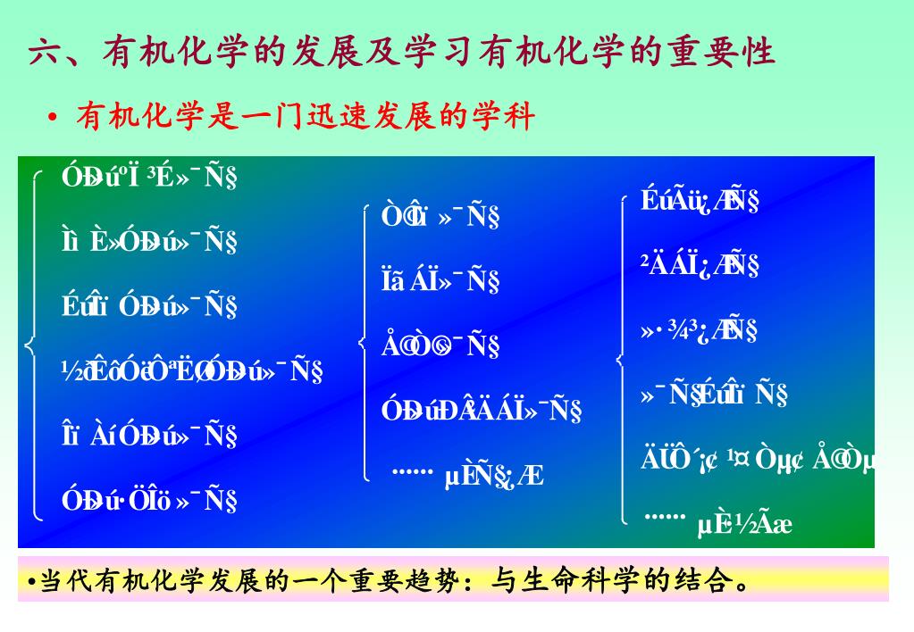 当代有机化学发展的一个重要趋势:与生命科学的结合。当代有机化学发展的一个重要趋势:与生命科学的结合。 六、有机化学的发展及学习有机化学的重要性 • 有机化学是一门迅速发展的学科