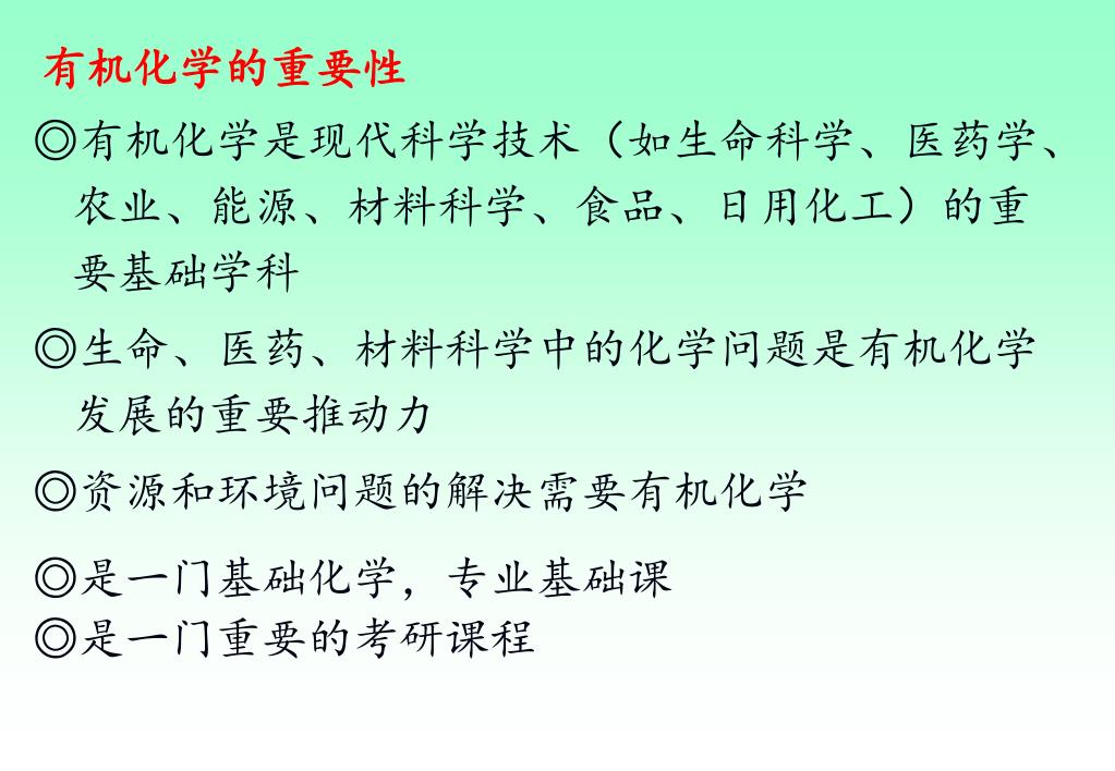 有机化学的重要性 ◎有机化学是现代科学技术(如生命科学、医药学、农业、能源、材料科学、食品、日用化工)的重要基础学科 ◎生命、医药、材料科学中的化学问题是有机化学发展的重要推动力 ◎资源和环境问题的解决需要有机化学 ◎是一门基础化学,专业基础课 ◎是一门重要的考研课程