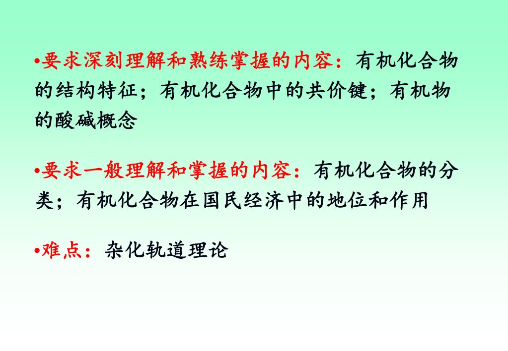 要求深刻理解和熟练掌握的内容:有机化合物的结构特征;有机化合物中的共价键;有机物的酸碱概念要求深刻理解和熟练掌握的内容:有机化合物的结构特征;有机化合物中的共价键;有机物的酸碱概念 • 要求一般理解和掌握的内容:有机化合物的分类;有机化合物在国民经济中的地位和作用 • 难点:杂化轨道理论