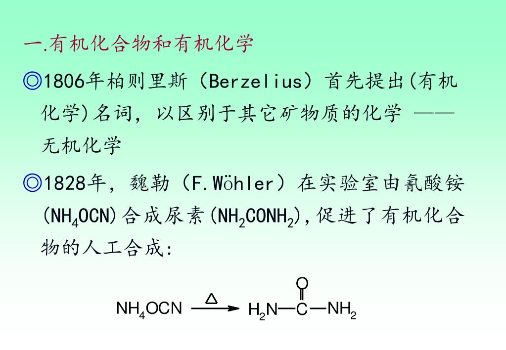 一.有机化合物和有机化学 ◎1806年柏则里斯(Berzelius)首先提出(有机化学)名词,以区别于其它矿物质的化学 ——无机化学 ◎1828年,魏勒(F.Wöhler)在实验室由氰酸铵(NH4OCN)合成尿素(NH2CONH2),促进了有机化合物的人工合成: