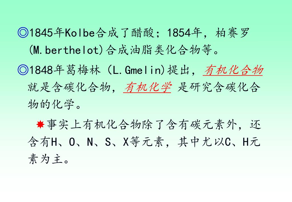 ◎1845年Kolbe合成了醋酸;1854年,柏赛罗(M.berthelot)合成油脂类化合物等。◎1845年Kolbe合成了醋酸;1854年,柏赛罗(M.berthelot)合成油脂类化合物等。 ◎1848年葛梅林(L.Gmelin)提出,有机化合物 就是含碳化合物,有机化学是研究含碳化合物的化学。 事实上有机化合物除了含有碳元素外,还含有H、O、N、S、X等元素,其中尤以C、H元素为主。