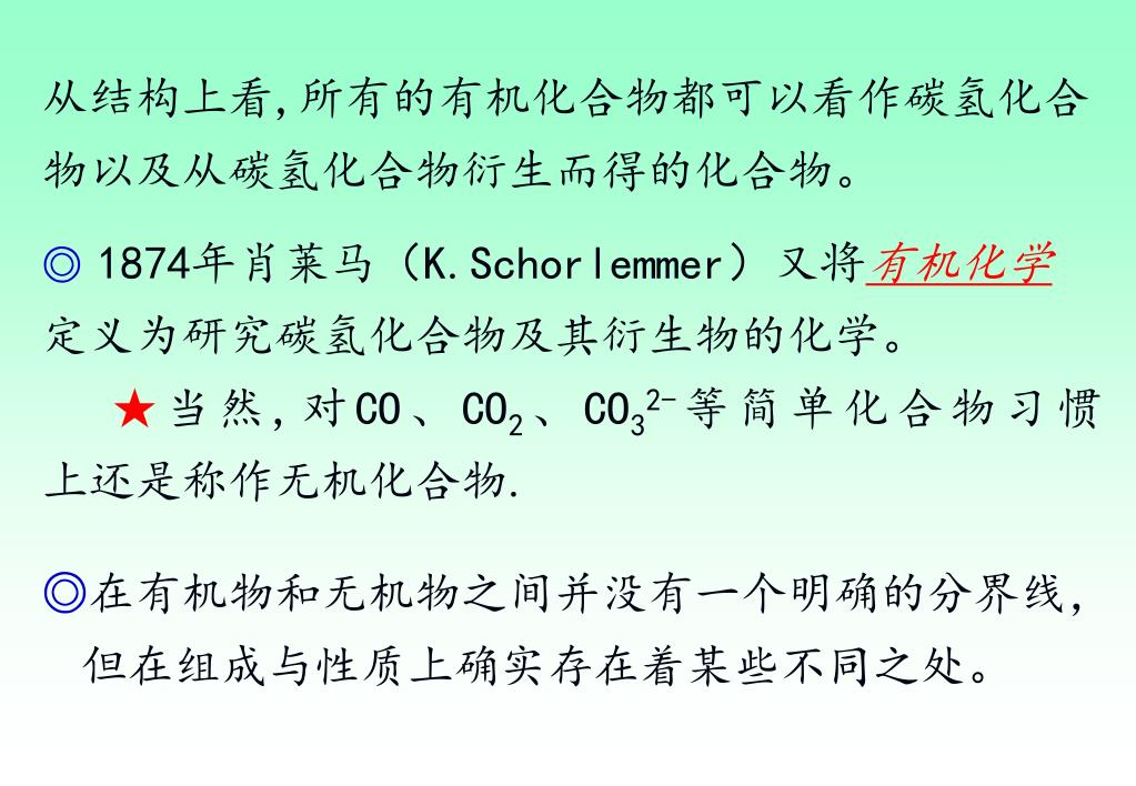 从结构上看,所有的有机化合物都可以看作碳氢化合物以及从碳氢化合物衍生而得的化合物。从结构上看,所有的有机化合物都可以看作碳氢化合物以及从碳氢化合物衍生而得的化合物。 ◎1874年肖莱马(K.Schorlemmer)又将有机化学 定义为研究碳氢化合物及其衍生物的化学。 ★当然,对CO、CO2、CO32-等简单化合物习惯 上还是称作无机化合物. ◎在有机物和无机物之间并没有一个明确的分界线,但在组成与性质上确实存在着某些不同之处。
