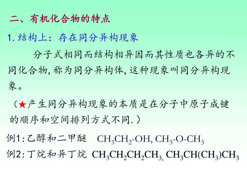 二、有机化合物的特点 1.结构上:存在同分异构现象 分子式相同而结构相异因而其性质也各异的不同化合物,称为同分异构体,这种现象叫同分异构现象。 (★产生同分异构现象的本质是在分子中原子成键的顺序和空间排列方式不同.) 例1:乙醇和二甲醚CH3CH2-OH, CH3-O-CH3 例2:丁烷和异丁烷CH3CH2CH2CH3, CH3CH(CH3)CH3