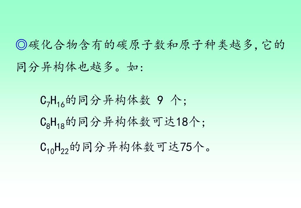 C7H16的同分异构体数 9 个; C8H18的同分异构体数可达18个; C10H22的同分异构体数可达75个。 ◎碳化合物含有的碳原子数和原子种类越多,它的同分异构体也越多。如: