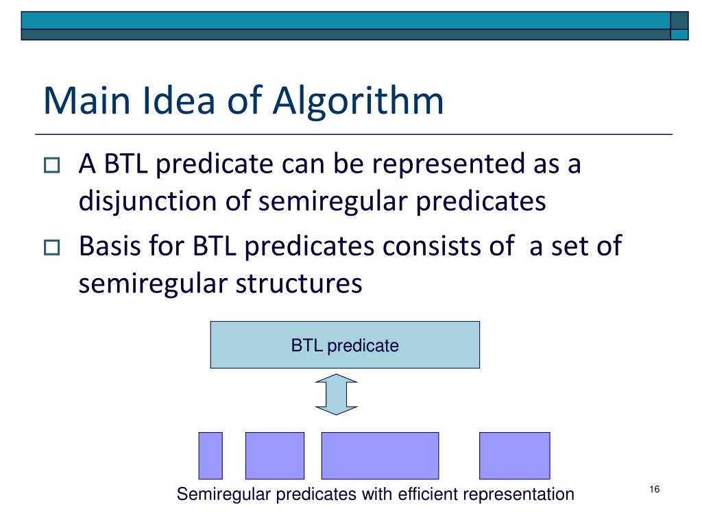 Main Idea of Algorithm • A BTL predicate can be represented as a disjunction of semiregular predicates • Basis for BTL predicates consists of a set of semiregular structures BTL predicate Semiregular predicates with efficient representation