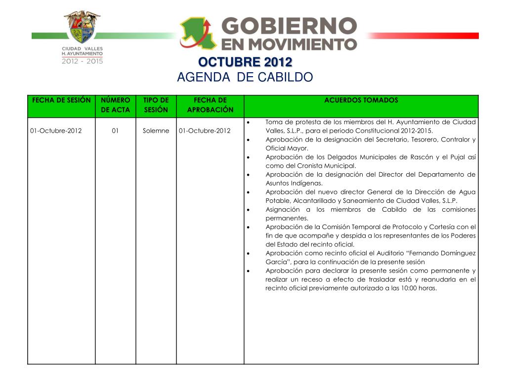 DIC IEMBRE 2012 AGENDA DE CABILDO. NOVIEMBRE 2012 AGENDA DE CABILDO. OCTUBRE 2012 AGENDA DE CABILDO.