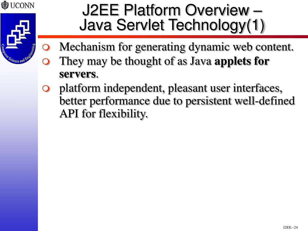 J2EE Platform Overview – Java Servlet Technology(1) • Mechanism for generating dynamic web content. • They may be thought of as Java applets for servers. • platform independent, pleasant user interfaces, better performance due to persistent well-defined API for flexibility.