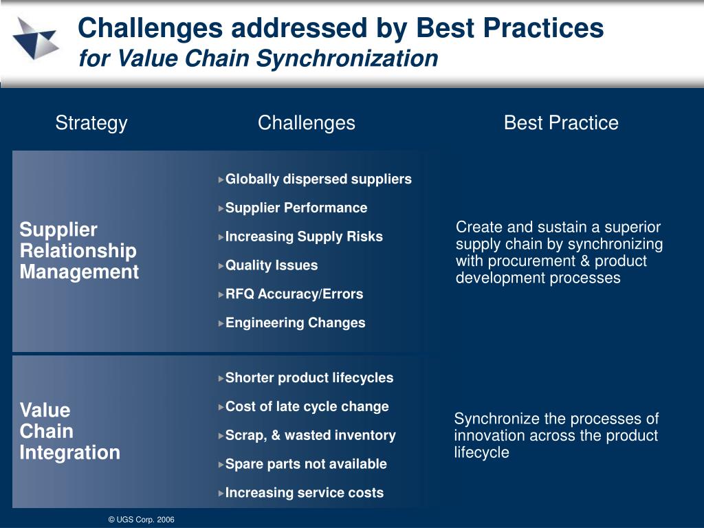 Challenges addressed by Best Practices for Value Chain Synchronization Strategy Challenges Best Practice SupplierRelationshipManagement • Globally dispersed suppliers • Supplier Performance • Increasing Supply Risks • Quality Issues • RFQ Accuracy/Errors • Engineering Changes Create and sustain a superior supply chain by synchronizing with procurement & product development processes • Shorter product lifecycles • Cost of late cycle change • Scrap, & wasted inventory • Spare parts not available • Increasing service costs ValueChain Integration Synchronize the processes of innovation across the product lifecycle