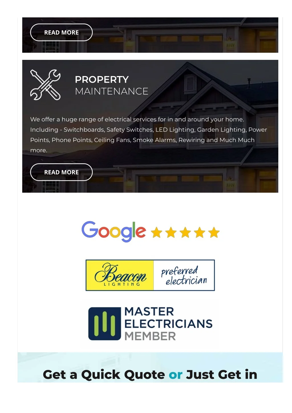 READ MORE PROPERTY MAINTENANCE We offer a huge range of electrical services for in and around your home. Including - Switchboards, Safety Switches, LED Lighting, Garden Lighting, Power Points, Phone Points, Ceiling Fans, Smoke Alarms, Rewiring and Much Much more. READ MORE Get a Quick Quote or Just Get in