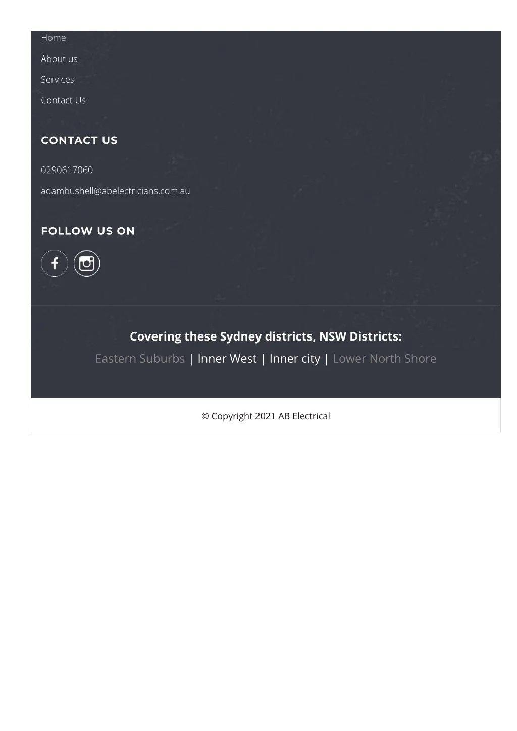 Home About us Services Contact Us CONTACT US 0290617060 adambushell@abelectricians.com.au FOLLOW US ON Covering these Sydney districts, NSW Districts: Eastern Suburbs | Inner West | Inner city | Lower North Shore © Copyright 2021 AB Electrical