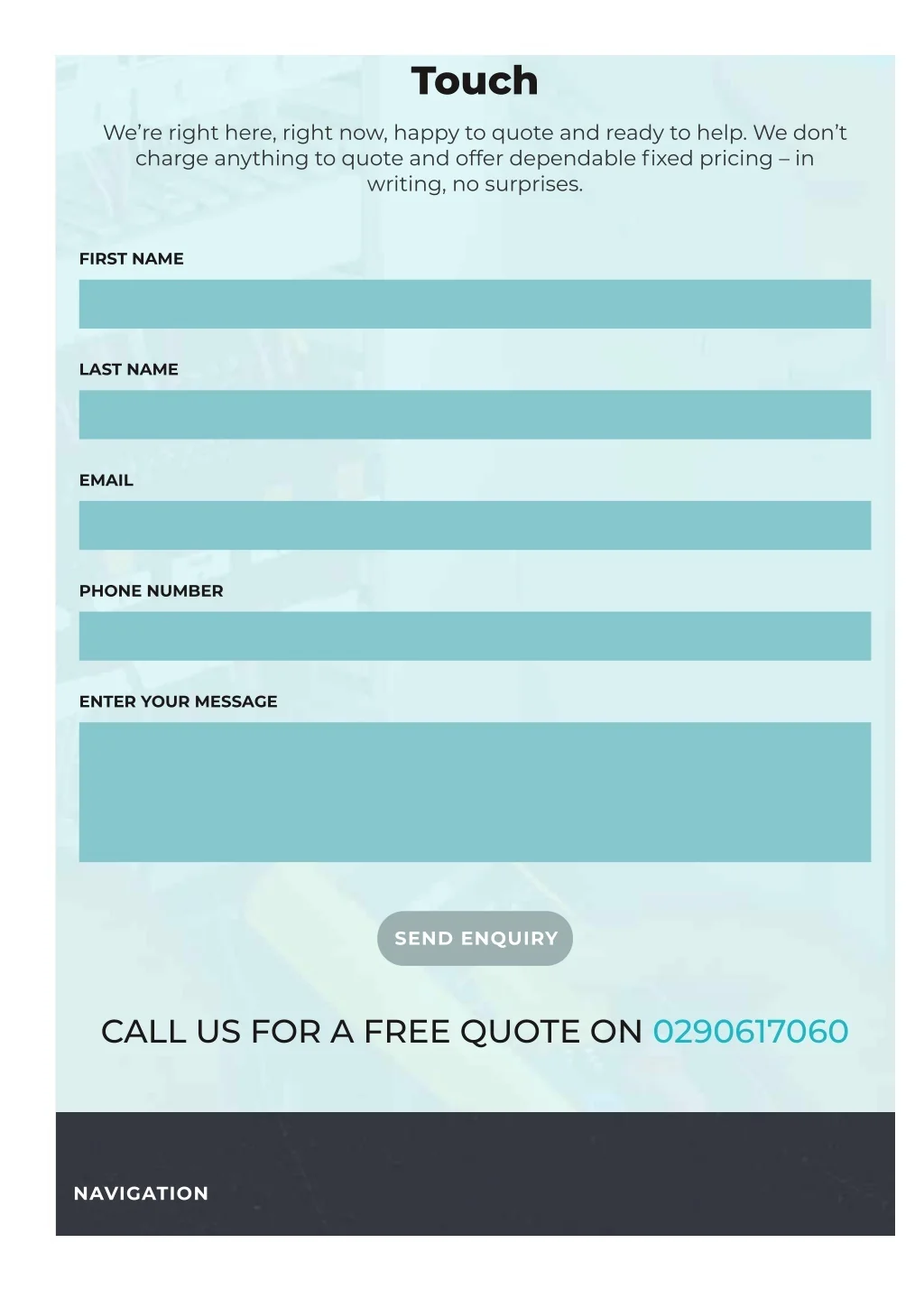 Touch We’re right here, right now, happy to quote and ready to help. We don’t charge anything to quote and offer dependable 몭xed pricing – in writing, no surprises. FIRST NAME LAST NAME EMAIL PHONE NUMBER ENTER YOUR MESSAGE SEND ENQUIRY CALL US FOR A FREE QUOTE ON 0290617060 NAVIGATION