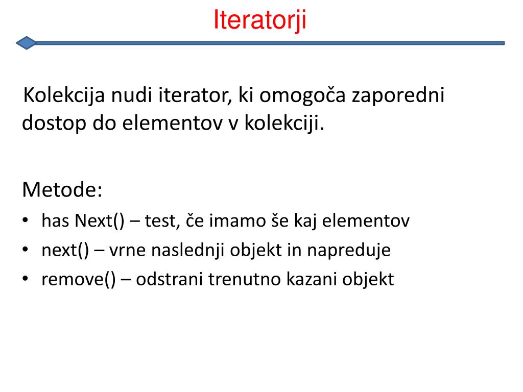 Kolekcija nudi iterator, ki omogoča zaporedni dostop do elementov v kolekciji. Metode: has Next() – test, če imamo še kaj elementov next() – vrne naslednji objekt in napreduje remove() – odstrani trenutno kazani objekt Iteratorji
