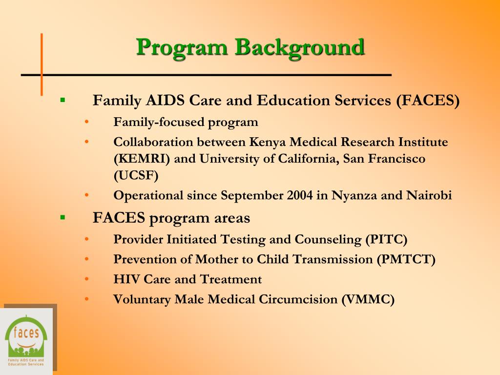 Program Background • Family AIDS Care and Education Services (FACES) • Family-focused program • Collaboration between Kenya Medical Research Institute (KEMRI) and University of California, San Francisco (UCSF) • Operational since September 2004 in Nyanza and Nairobi • FACES program areas • Provider Initiated Testing and Counseling (PITC) • Prevention of Mother to Child Transmission (PMTCT) • HIV Care and Treatment • Voluntary Male Medical Circumcision (VMMC)