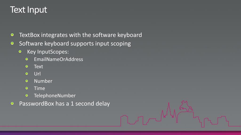 Text Input • TextBoxintegrates with the software keyboard • Software keyboard supports input scoping • Key InputScopes: • EmailNameOrAddress • Text • Url • Number • Time • TelephoneNumber • PasswordBox has a 1 second delay
