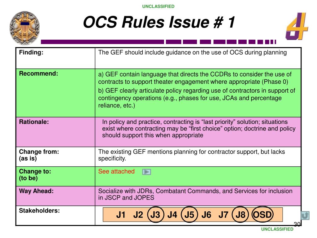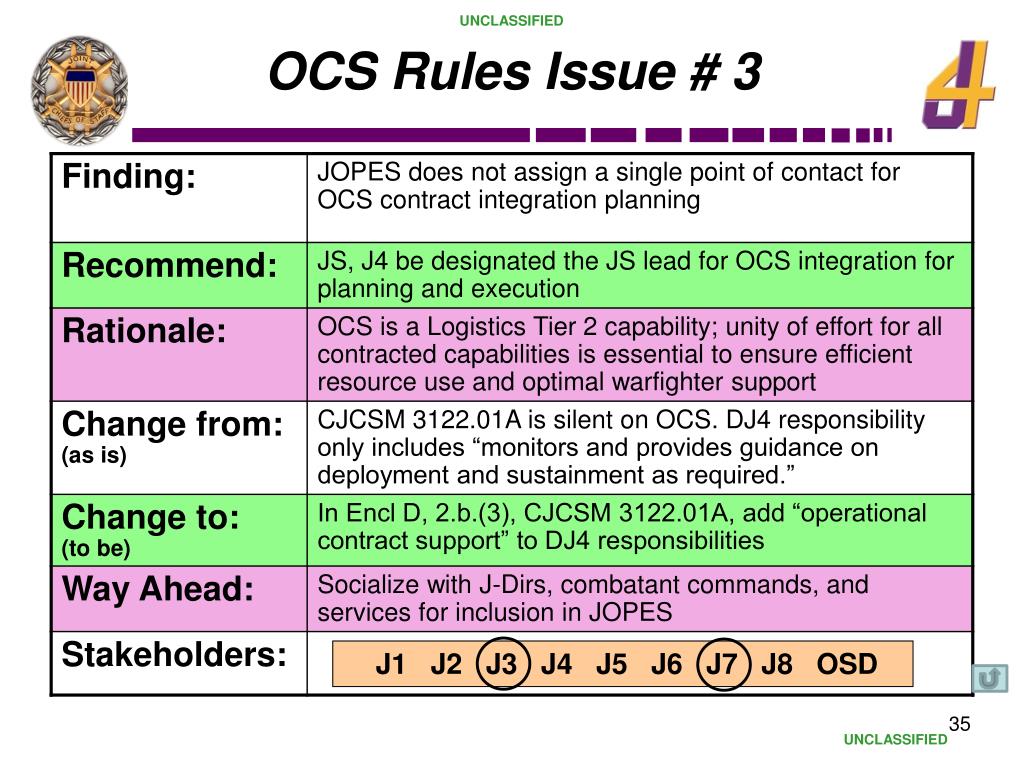 Rules – Recommendation 3 JOPESdoes not assign a single point of contact for OCS contract integration planning • Recommend: The JOPES designate the JS, J4 as the JS lead for OCS integration for planning and visibility into execution • Rationale: Absence of OCS planning is a recognized shortfall. Unity of effort across J-Dirs for OCS is lacking. Clear guidance on the duties and responsibilities with respect to OCS is required. Placing this in JOPES Volume I, CJCSM 3122.01A, will codify the responsibility.