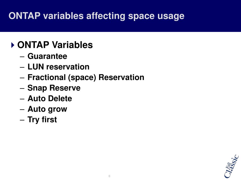 ONTAP variables affecting space usage • ONTAP Variables • Guarantee • LUN reservation • Fractional (space) Reservation • Snap Reserve • Auto Delete • Auto grow • Try first