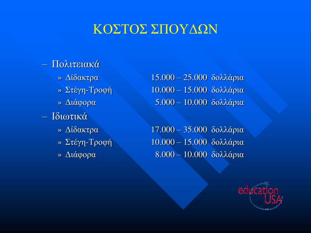 ΚΟΣΤΟΣ ΣΠΟΥΔΩΝ • Πολιτειακά • Δίδακτρα 15.000 – 25.000 δολλάρια • Στέγη-Τροφή 10.000 – 15.000 δολλάρια • Διάφορα 5.000 – 10.000 δολλάρια • Ιδιωτικά • Δίδακτρα 17.000 – 35.000 δολλάρια • Στέγη-Τροφή 10.000 – 15.000 δολλάρια • Διάφορα 8.000 – 10.000 δολλάρια