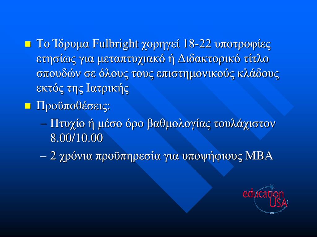 Το Ίδρυμα Fulbright χορηγεί 18-22 υποτροφίες ετησίως για μεταπτυχιακό ή Διδακτορικό τίτλο σπουδών σε όλους τους επιστημονικούς κλάδους εκτός της Ιατρικής • Προϋποθέσεις: • Πτυχίο ή μέσο όρο βαθμολογίας τουλάχιστον 8.00/10.00 • 2 χρόνια προϋπηρεσία για υποψήφιους MBA