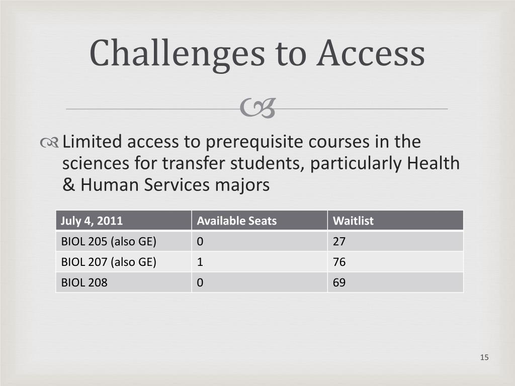 Challenges to Access • Limited access to prerequisite courses in the sciences for transfer students, particularly Health & Human Services majors