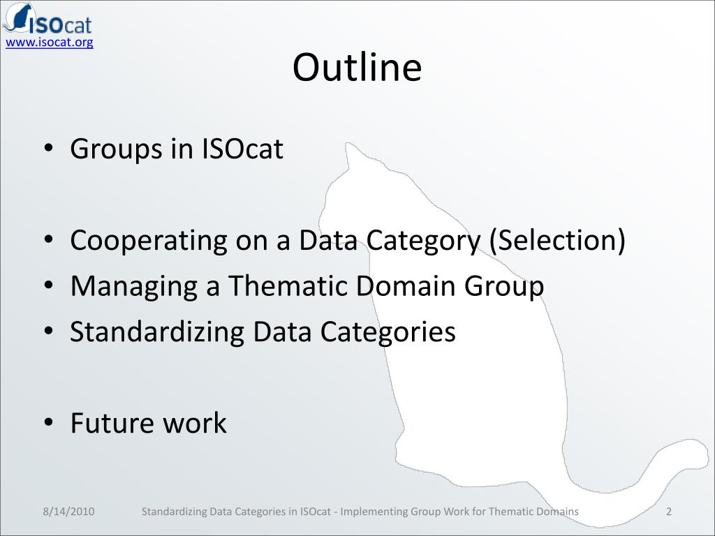 Outline • Groups in ISOcat • Cooperating on a Data Category (Selection) • Managing a Thematic Domain Group • Standardizing Data Categories • Future work Standardizing Data Categories in ISOcat - Implementing Group Work for Thematic Domains