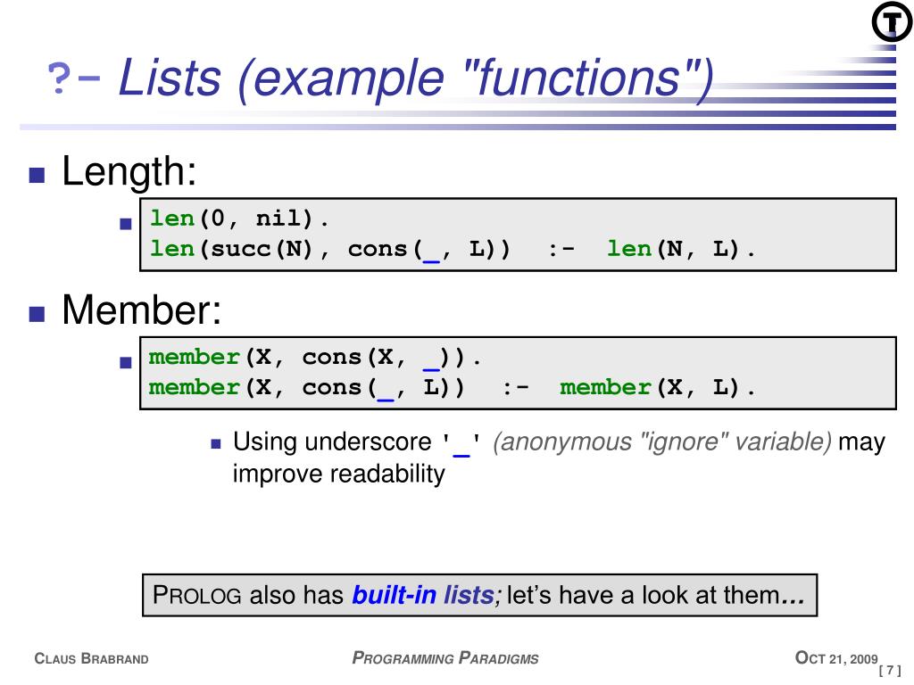 T Lists (example "functions") • Length: • Member: • Using underscore '_'(anonymous "ignore" variable)may improve readability len(0, nil). len(succ(N), cons(_, L)) :- len(N, L). len(0, nil). len(succ(N), cons(E, L)) :- len(N, L). member(X, cons(X, _)). member(X, cons(_, L)) :- member(X, L). member(X, cons(X, L)). member(X, cons(E, L)) :- member(X, L). PROLOG also has built-in lists; let’s have a look at them…