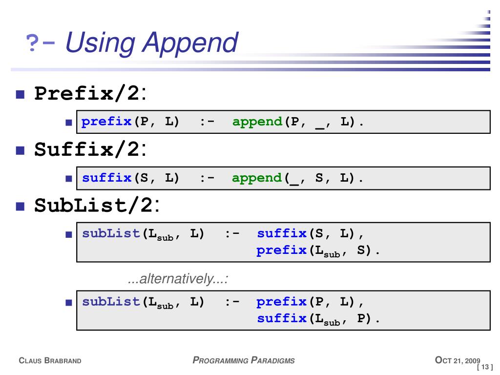Using Append • Prefix/2: • Suffix/2: • SubList/2: ...alternatively...: prefix(P, L) :- append(P, _, L). suffix(S, L) :- append(_, S, L). subList(Lsub, L) :- suffix(S, L), prefix(Lsub, S). subList(Lsub, L) :- prefix(P, L), suffix(Lsub, P).