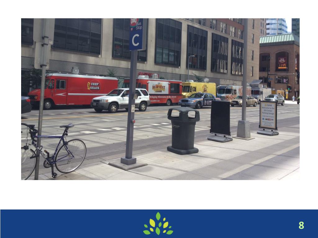 Minneapolis Food Trucks • History • Longstanding ordinance allowing food carts on Nicollet Mall • 2010 - new ordinance allowing mobile food vendors (food trucks) on sidewalks and in parking lots • 6 vendors first year • 2011 modification of ordinance to allow MFV locations at meters and in transit lane of Marquette and 2nd Avenues (off peak)