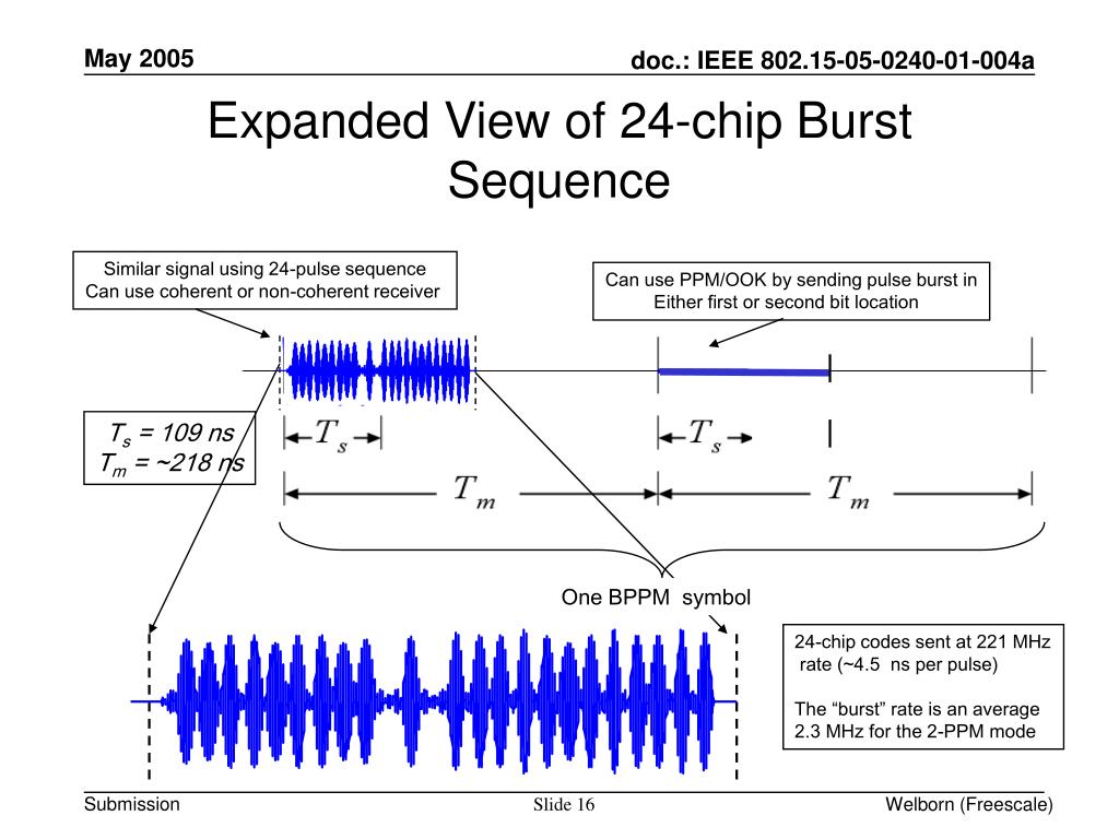 Signal structure using a 31-chip Burst Sequence Hypothetical signal using 31-pulse sequence Can use coherent or non-coherent receiver Can use PPM/OOK by sending pulse burst in Either first or second bit location Ts = 140 ns Tm = ~290 ns Based on same 31-chip sequences proposed by Francois Chin of I2R at ~4.5 ns Tc spacing These codes need to be further analyzed to make sure spectral properties are acceptable Welborn (Freescale)