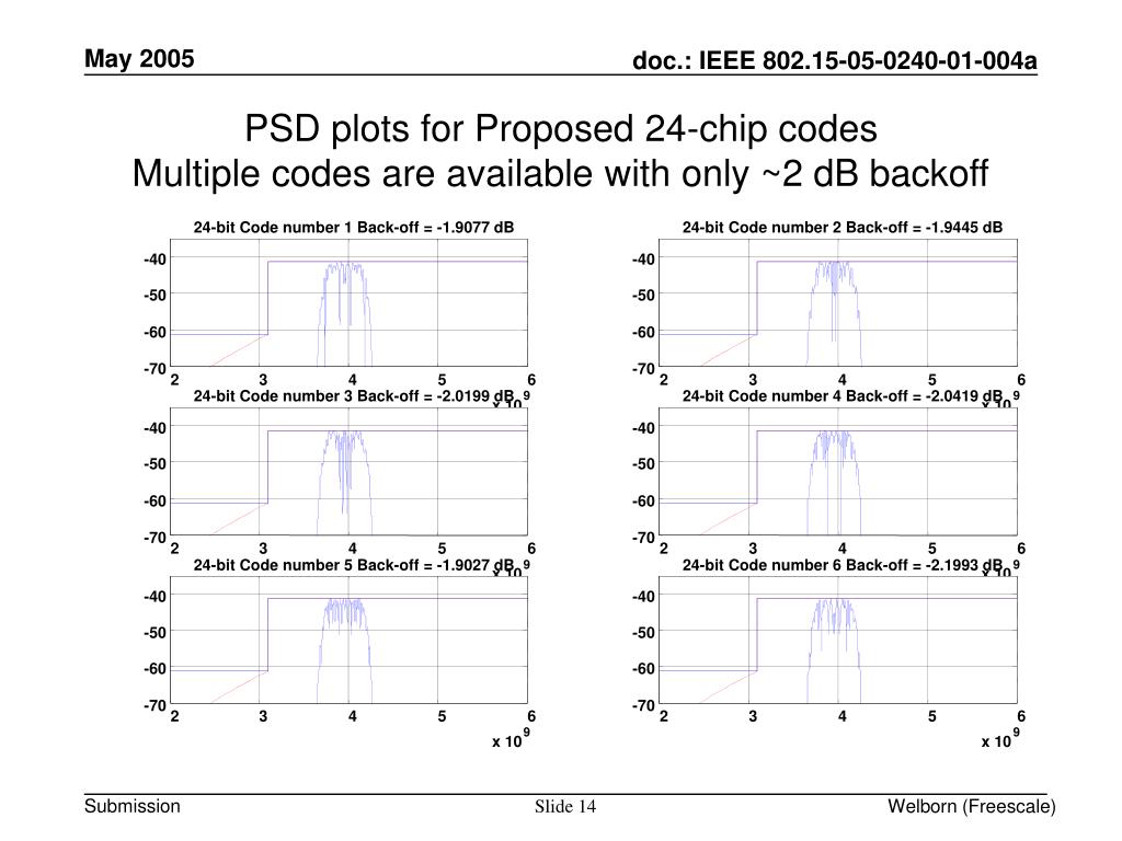 24-bit Code number 1 Back-off = -1.9077 dB 24-bit Code number 2 Back-off = -1.9445 dB -40 -40 -50 -50 -60 -60 -70 -70 2 3 4 5 6 2 3 4 5 6 24-bit Code number 3 Back-off = -2.0199 dB 24-bit Code number 4 Back-off = -2.0419 dB 9 9 x 10 x 10 -40 -40 -50 -50 -60 -60 -70 -70 2 3 4 5 6 2 3 4 5 6 24-bit Code number 5 Back-off = -1.9027 dB 24-bit Code number 6 Back-off = -2.1993 dB 9 9 x 10 x 10 -40 -40 -50 -50 -60 -60 -70 -70 2 3 4 5 6 2 3 4 5 6 9 9 x 10 x 10 PSD plots for Proposed 24-chip codesMultiple codes are available with only ~2 dB backoff Welborn (Freescale)