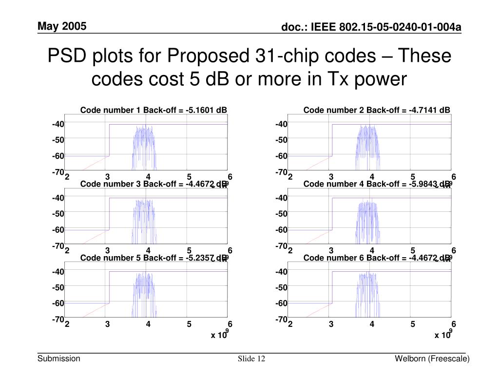 Code number 1 Back-off = -5.1601 dB Code number 2 Back-off = -4.7141 dB -40 -40 -50 -50 -60 -60 -70 -70 2 3 4 5 6 2 3 4 5 6 Code number 3 Back-off = -4.4672 dB Code number 4 Back-off = -5.9843 dB 9 9 x 10 x 10 -40 -40 -50 -50 -60 -60 -70 -70 2 3 4 5 6 2 3 4 5 6 Code number 5 Back-off = -5.2357 dB Code number 6 Back-off = -4.4672 dB 9 9 x 10 x 10 -40 -40 -50 -50 -60 -60 -70 -70 2 3 4 5 6 2 3 4 5 6 9 9 x 10 x 10 PSD plots for Proposed 31-chip codes – These codes cost 5 dB or more in Tx power Welborn (Freescale)