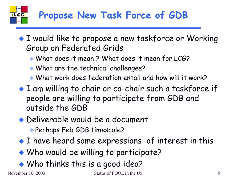 Propose New Task Force of GDB • I would like to propose a new taskforce or Working Group on Federated Grids • What does it mean ? What does it mean for LCG? • What are the technical challenges? • What work does federation entail and how will it work? • I am willing to chair or co-chair such a taskforce if people are willing to participate from GDB and outside the GDB • Deliverable would be a document • Perhaps Feb GDB timescale? • I have heard some expressions of interest in this • Who would be willing to participate? • Who thinks this is a good idea? Status of POOL in the US