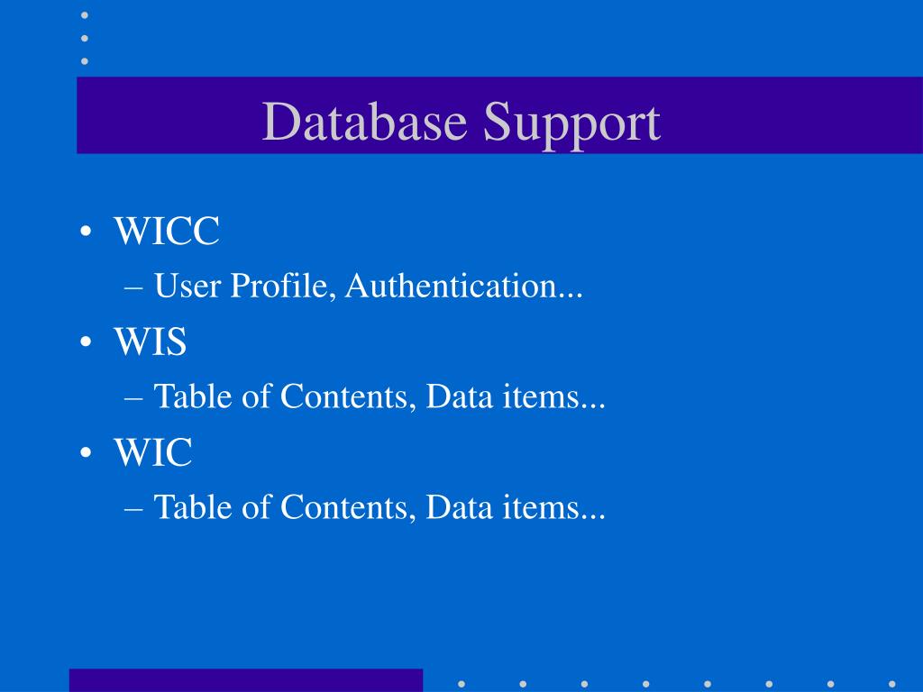 Database Support • WICC • User Profile, Authentication... • WIS • Table of Contents, Data items... • WIC • Table of Contents, Data items...